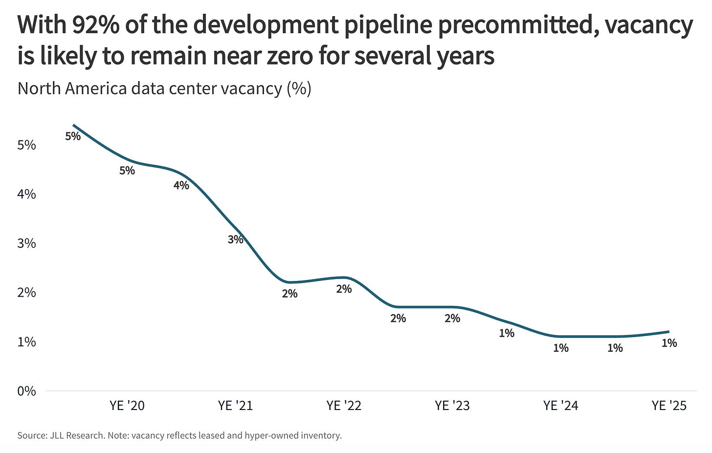 The compute that decentralized networks are best positioned to tap is not sitting in hyperscale datacenters, which are already running near capacity: commercial real estate firm JLL puts North American data center vacancy at a record low of 1%, with 92% of capacity under construction already pre-committed.