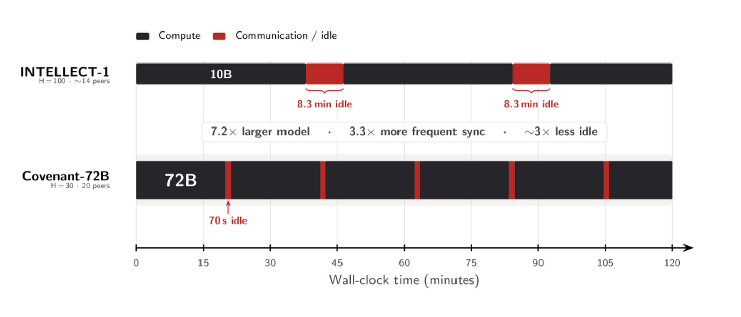 We must remind ourselves that Covenant-72B is on par with a three-year-old Meta model, nowhere near state of the art. What matters is that the coordination worked, not the output quality; the plumbing held, even if the water pressure is low. The training run averaged around 135 B200 GPUs working simultaneously, with 70+ unique servers rotating in and out over the course of the run. For comparison: Meta trained Llama 3.1 405B on 16,384 H100s over 54 days. xAI built a 100,000-GPU cluster in Memphis just to train Grok 3, then doubled it to 200,000. Even DeepSeek-V3, celebrated for its efficiency, used 2,048 H800s for under two months. Covenant used roughly 135. The gap between “distributed training works” and “distributed training competes at the frontier” remains wide. But as a proof of concept, training a 72-billion-parameter model across 70+ servers with zero venture funding and zero centralized infrastructure is a watershed moment.