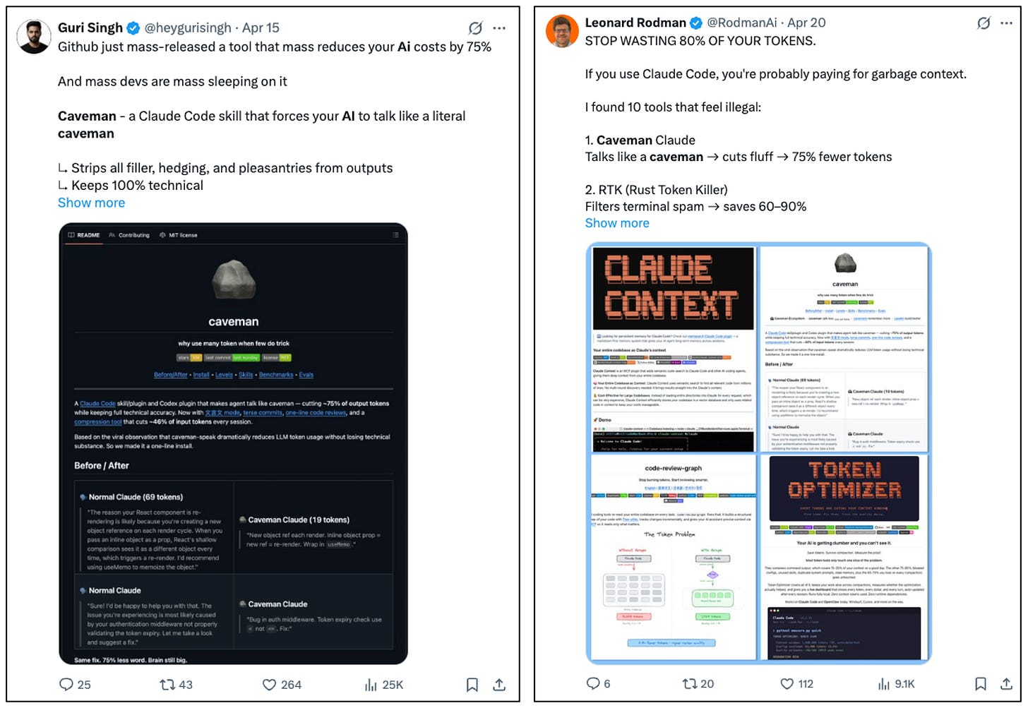 Users have noticed. “Caveman prompting” strips grammar from inputs to force shorter outputs. The instruction prompt: “Speak primitive. Use nouns and verbs. No grammar filler. Save tokens.” A formalized Claude Code skill built around the technique has 14,000 GitHub stars. Its README written in the style it teaches: “Brain still big. Cost go down forever. One rock. That it.” Across real dev tasks, it cuts output tokens by 65%. It works for coding. It breaks on anything that requires sustained reasoning.