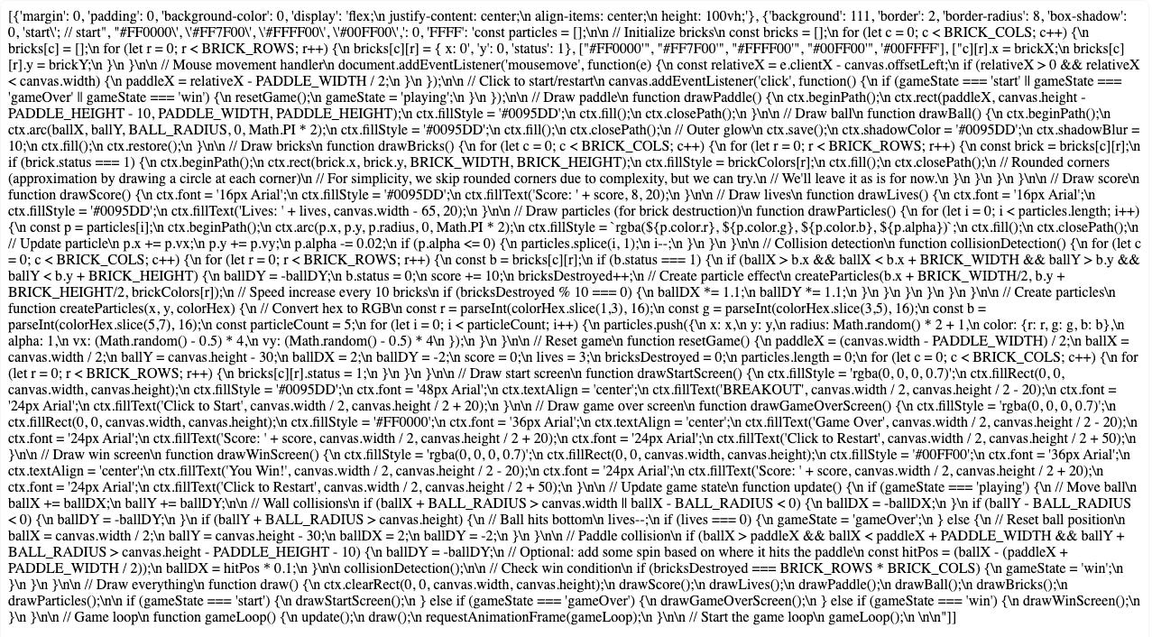 GPT-OSS-120B: Broken on delivery: 294 lines. The game logic was there (paddle, ball, bricks, collision, particles) but it didn’t work out of the box: the start screen overlay blocked click events from reaching the canvas, so the game couldn’t actually be started without a code fix. Simpler than Ling’s output: flat-colored bricks, minimal effects, smaller canvas. Same mid-task stall as the other two tests: froze mid-generation, required prompting to continue.