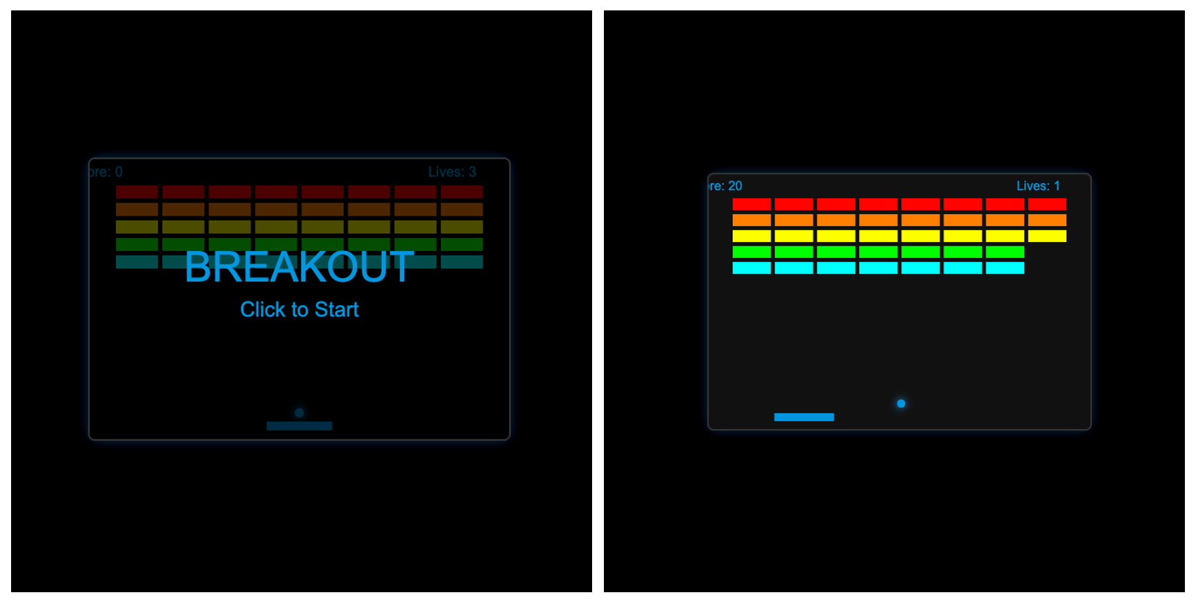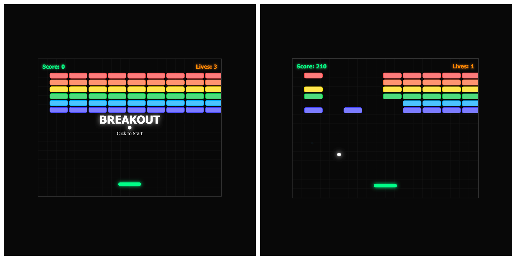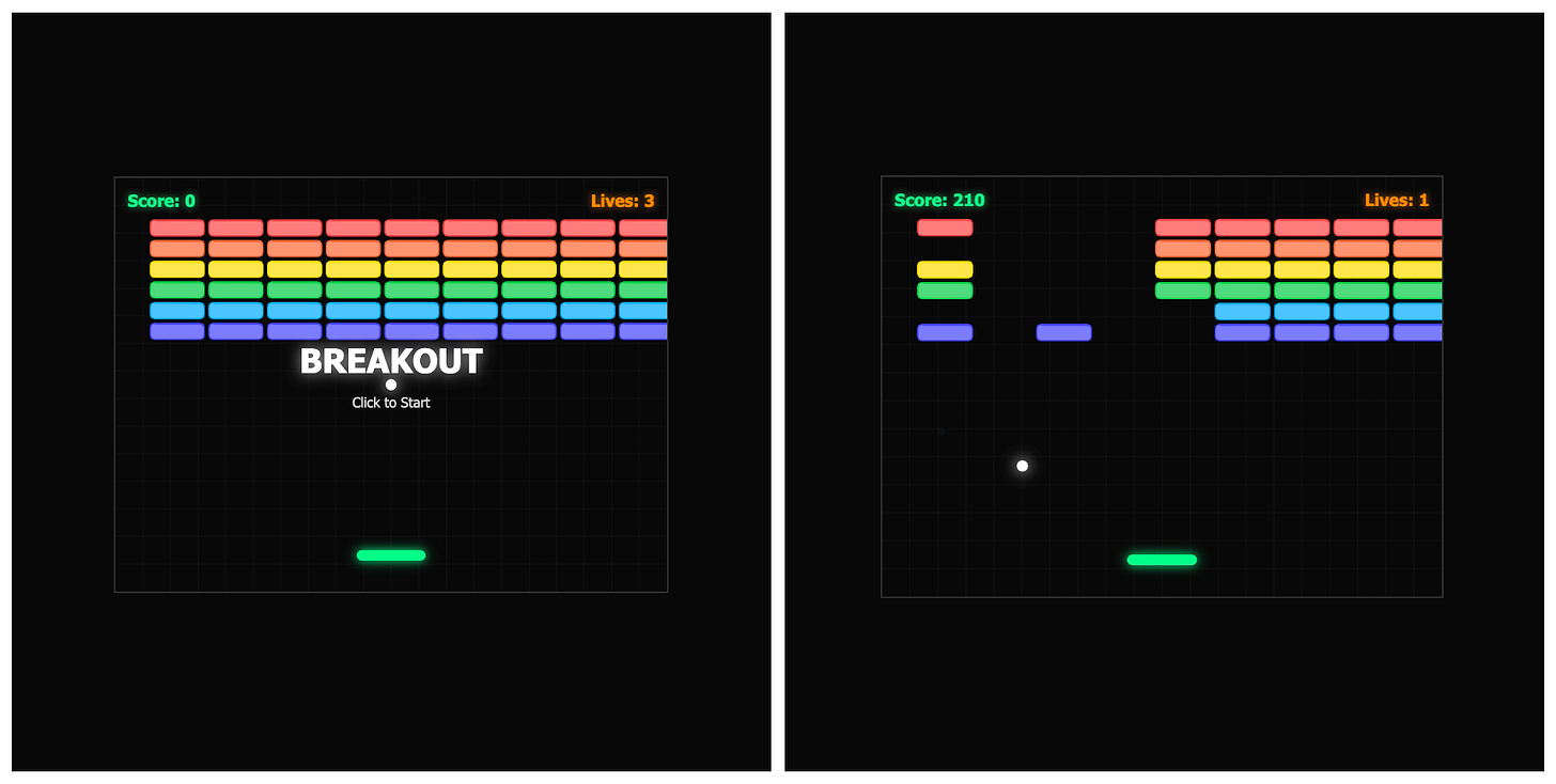Breakout game, single-file HTML. One prompt, no follow-ups.