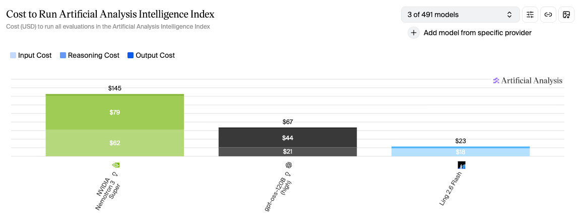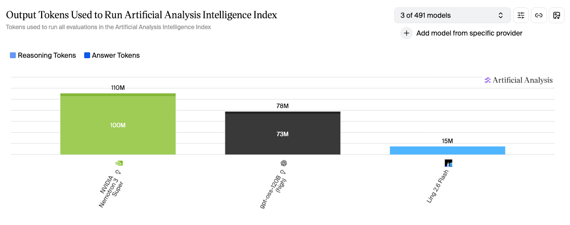 Nemotron used 110 million output tokens to complete the standardized AA Intelligence Index. GPT-OSS used 78 million. Ling used 15 million. That’s 86% fewer tokens than Nemotron and 81% fewer than GPT-OSS.