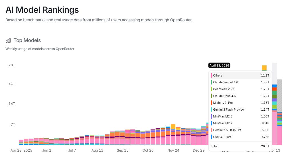 At this volume, every wasted token is real money. Claude Sonnet 4.6 alone processed 1.38 trillion tokens last week on OpenRouter. The OpenRouter State of AI report puts average prompt tokens at 6,000 per request versus 400 for completions, a 15:1 input-to-output ratio. Applied to Sonnet’s traffic, that works out to roughly $5.2M at list price ($3/M input, $15/M output) across one platform in seven days.