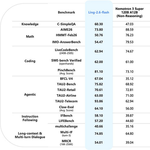 The AA Intelligence Index doesn’t test what agents actually do. The benchmarks that do tell a different story. BFCL-V4 measures function calling accuracy: Ling 67.04, GPT-OSS 43.3, Nemotron 35.12. TAU2-Telecom measures multi-step task completion: Ling 93.86, Nemotron 62.94, GPT-OSS 41.45. SWE-bench Verified: Ling 62.00, Nemotron 61.00, GPT-OSS 43.80. MRCR long-context: Ling 54.01, Nemotron 39.04. Ling leads on agentic benchmarks across the board. It trails Nemotron on hard math (AIME 73.80 vs 88.59).