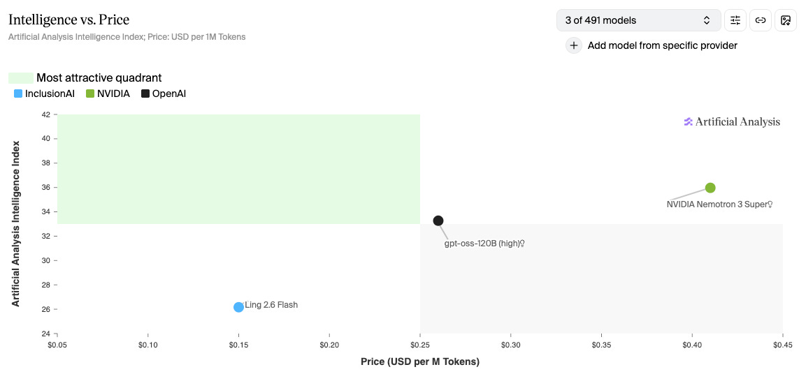 This is the chart where Ling looks weakest. Intelligence score: 26, against GPT-OSS’s 33 and Nemotron’s 36.