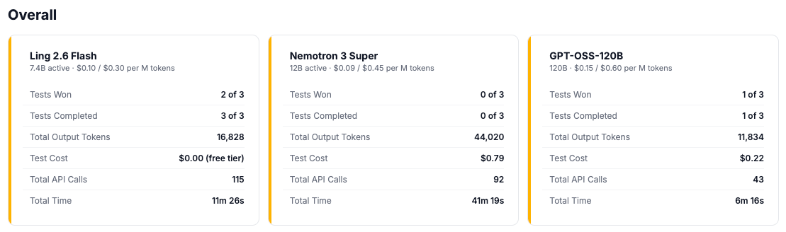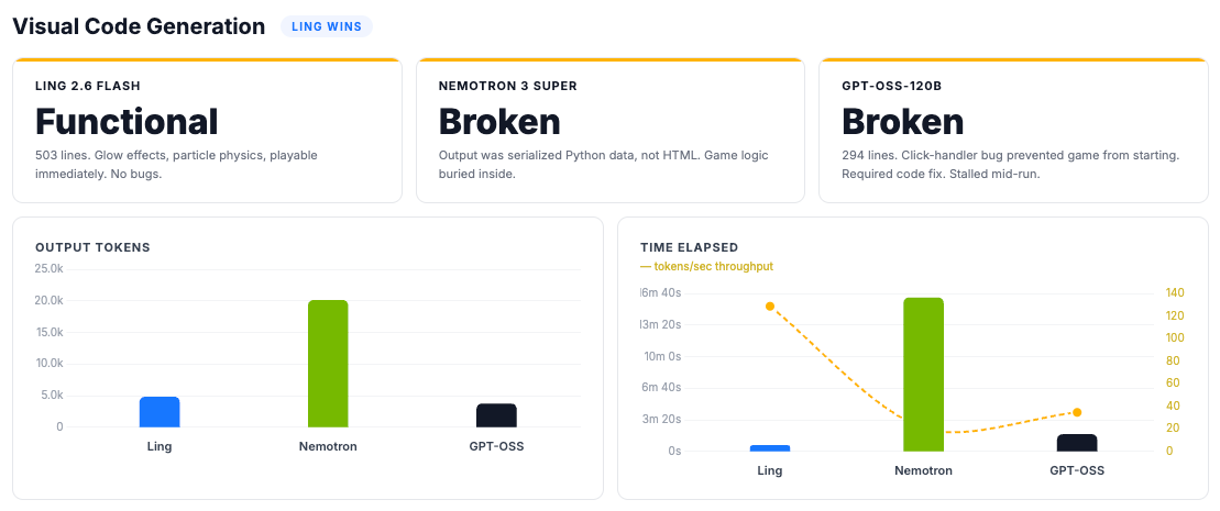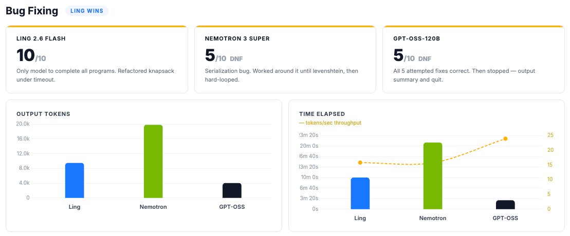 Across all three tests, Ling was the only model to complete every task without intervention. The competition failed in different ways: Nemotron’s serialization bug blocked it in every test. OSS was competent when working (every bug fix correct) but stalled mid-run across all three tests, each time requiring a prompt to continue, and its visual output didn’t work without a code fix. Completion and token efficiency moved together.