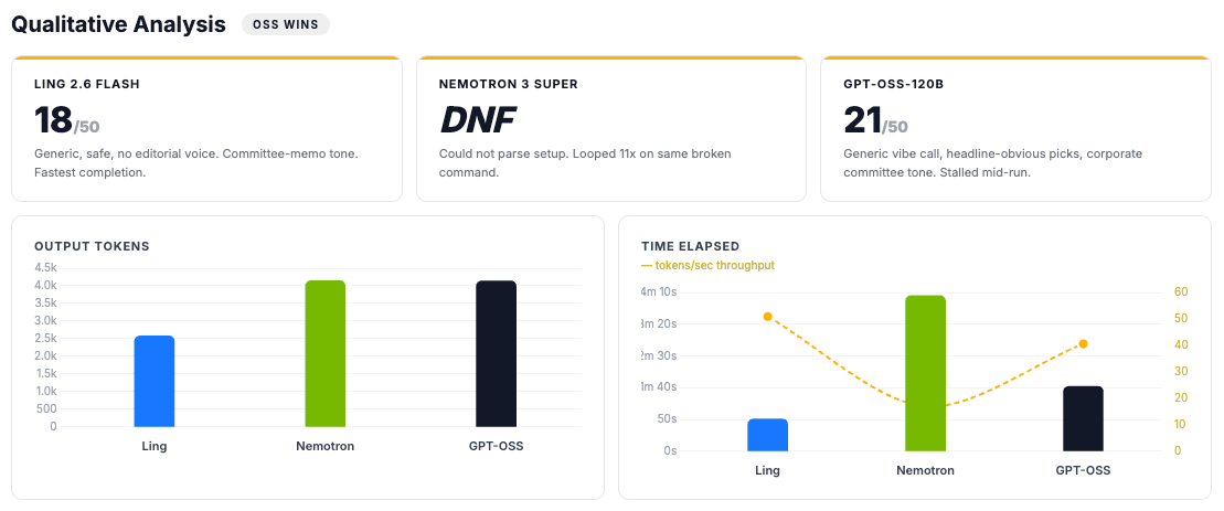 GPT-OSS-120B: 21/50: Similar tone. Generic vibe call, headline-obvious picks. Gemini flagged both for consultant-speak. Better discipline score kept it three points ahead.