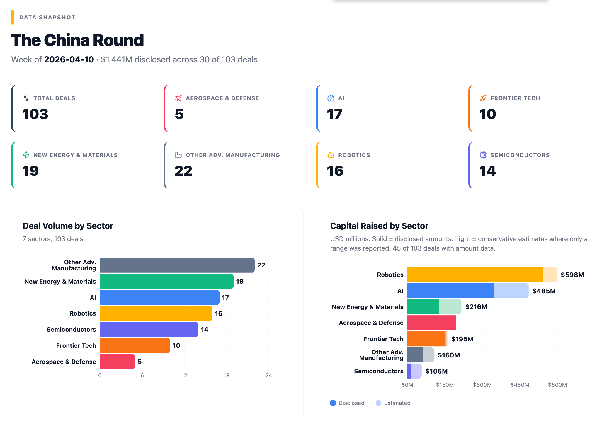 The China Round is a weekly report tracking venture and strategic investment activity across China’s core technology sectors: AI, robotics, semiconductors, new energy and materials, aerospace and defense, and frontier tech.